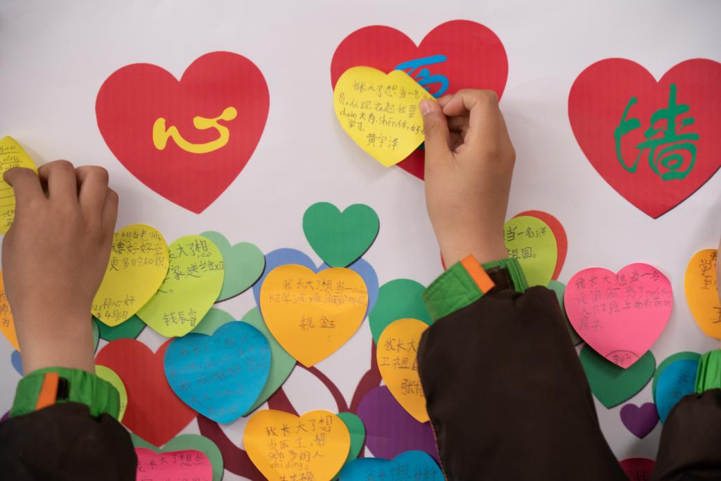 红色故事与大国重器的画面激起了孩子们的浓浓爱党爱国之情,在江科大学子的倡议下,老员工牵手小员工,各自书写心愿卡并粘贴成一棵心愿树,一张张彩色便利贴上的稚嫩笔迹寄托了他们对于未来的想象,“我以后一定要入党,为更多的人帮忙。”,一(10)班的一位小同学郑重地对大家说道。