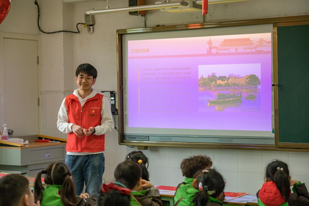 “‘红星闪闪’我是接班人”活动伊始,江科大学子向孩子们讲解了中国共产党的百年发展历史,在他们深入浅出、通俗易懂的讲解下,镇江市中山路小学的孩子们了解到党在发展壮大的一百年里不断接受考验、以实际行动赢得人民群众拥护和信赖、走过百年风雨的峥嵘岁月里的故事。“没有共产党就没有新中国”,孩子们用朴实真挚的情感诉说着对中国共产党的热爱,诉说着对党信念之火的追索。