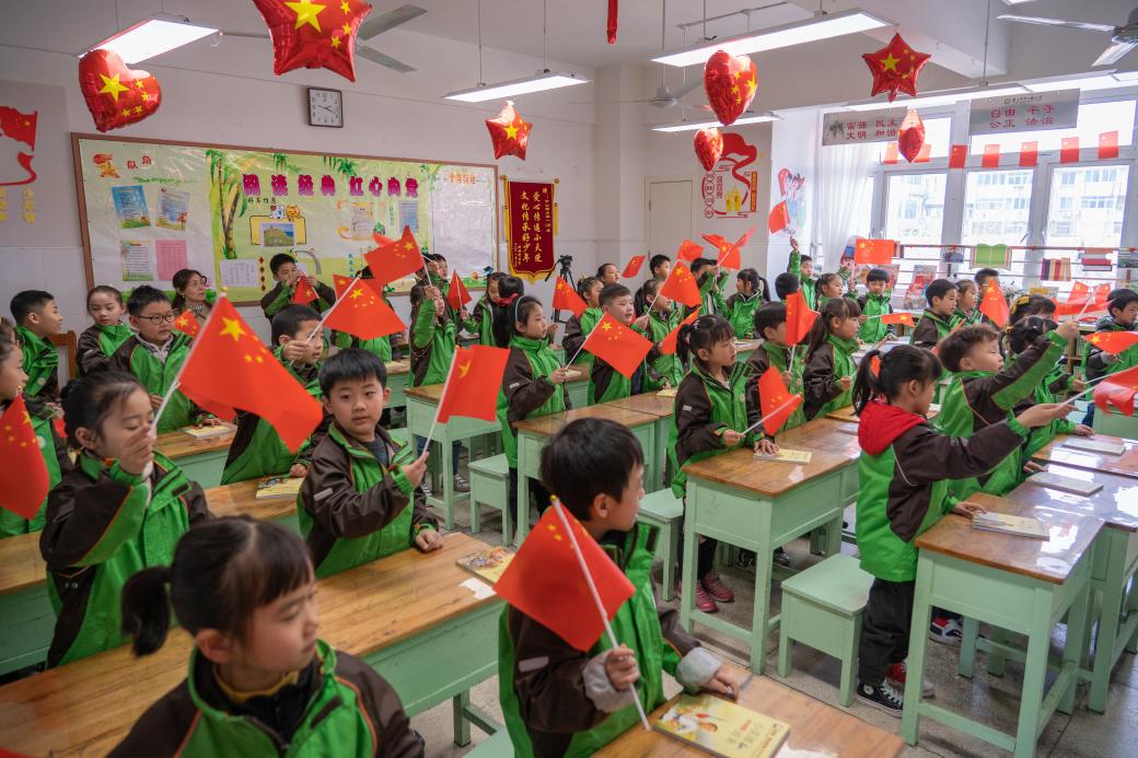 为激发孩子们心中的爱国之情,江科大学子们带领孩子们集体观看了《厉害了我的国》影片片段,并向他们介绍了中国超级工程发展的现状。随着视频中国产航母下水、万吨大驱首舰下水、国产大型邮轮吊装工作完成等画面的播放,孩子们无不心潮澎湃、满怀激动,中华儿女的自豪之情在所有人脸上洋溢。