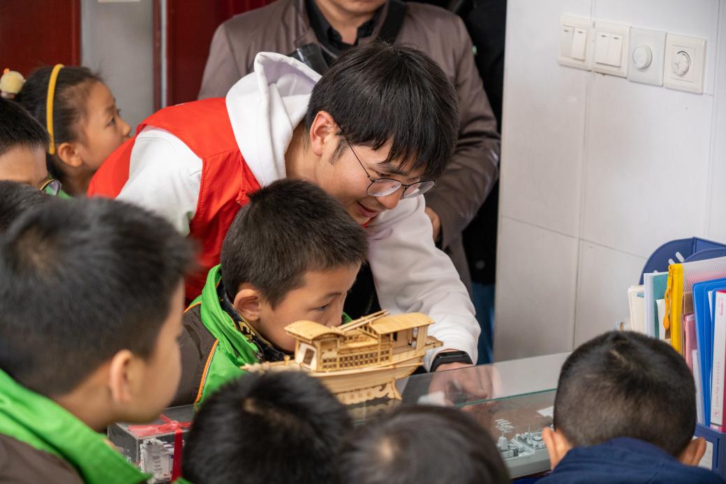 回顾百年征程,正是在中国共产党的坚强领导下,中国船舶工业自战火中重生,在发展中壮大,从无到有、从小到大、从弱到强,一路劈波斩浪,纵横万里海疆,勇闯远海大洋。江科大学子为孩子们简述了近现代船舶工业发展史,并结合实物船模进行了详细讲解。来自太阳成集团tyc234cc海航模型协会成员武成龙、贾真玉、谭舒铭生动形象地为孩子们讲述了一艘导弹驱逐舰和一艘集装箱船背后的红色故事。孩子们带着对红色历史的好奇心,在和江科大学子的互动中接受了一场鲜活的党史学习教育。