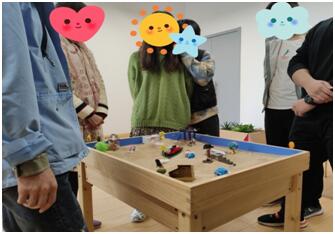 此次“心海罗盘”体验活动为团体沙盘游戏。王爱萍老师为大家介绍了沙盘游戏的规则,团队中的六位同学不通过语言交流,每人从陈列架上选择一个沙具摆放在沙盘中,依据观察其他队员的沙具,选择自己的摆放方案。六轮摆放制作以后,名为“人生”的沙盘作品诞生了。