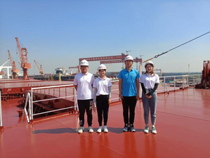 实践团成员先后登上了32.5万吨矿砂船与5万吨油船,并在生产部指挥的引领下参观了船上的作业甲板、驾驶室、机舱等。通过详细地介绍了各设备的使用以及驾驶台仪器的功能,实践团成员们在对整船构造充分了解的同时,也表现出了极大的兴趣,抓住这一难得的机会向生产负责人咨询了很多生产的细节问题,相关技术骨干认真仔细地讲解并回答了实践团成员们提出的各种问题,并鼓励同学们毕业后投身船舶工业的发展中,为建设海洋强国做出自己的贡献。