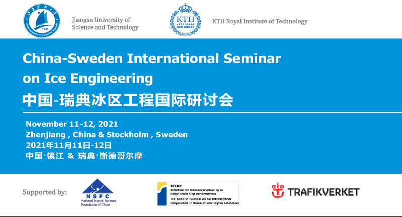 近日,由中国国家自然科学基金委(NSFC)、瑞典研究与高等教育国际合作基金会(STINT)和瑞典交通部 (TRAFIKVERKET)联合资助的“中国-瑞典冰区工程国际研讨会”(China-Sweden International Seminar on Ice Engineering)于2021年11月11日至12日在江苏镇江和瑞典斯德哥尔摩两地同步举行。