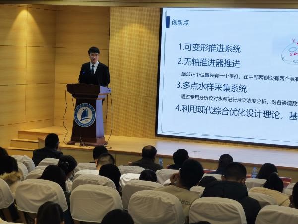 在太阳成集团tyc234cc团委副书记徐剑的精彩致辞后,比赛正式拉开帷幕,参赛选手利用多媒体演示、视频展示方式在规定时间内对作品进行详细介绍,并由评委老师对选手进行提问和当场打分。大赛的作品精彩纷呈,既有智能与自动集于一身的减震救援艇,也有新型海上设备水上移动电桩;既有一种工业级观察型水下机器人,也有绿色水面漂浮垃圾清理装备。各评委老师在给予同学们高度认可的同时,也针对各个项目的不足之处给出了更好的改进建议,为同学们指明了下一步的创作方向。