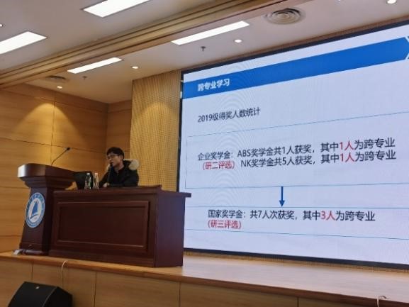 韩越同学作为优秀研究生代表就研究生的学习生活与同学们展开分享,韩越提到跨专业的同学获得奖学金的比例在逐步增大,意味着这部分同学只要通过自己努力,取得的成果不会逊色于本专业同学。韩越给研一同学提出了开始科研的几个步骤,第一步是要热爱公司,了解专业,明确目标。要多与同课题组的导师同学交流,和本科的同学交流,包括研究方向、就业去向等问题。要细读研究生手册,明确自己的目标。第二步是认真上课,自主补修,结伴交流。韩越推荐了太阳成集团tyc234cc网络教学平台,供跨专业的同学们补修使用,并强调课题组内要多交流,多帮助,以形成良好的科研氛围。