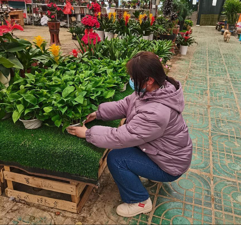 实践团成员蒋文馨在家乡谷里社区利用寒假时间在本地组织的绿色植株展览活动中作为展览组织的志愿者,协助展厅排位,帮助摊位完成展览装饰,通过绿植展览在乡推广绿色生活的理念。