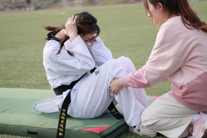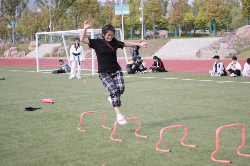 活动开始前,由社团成员组织参赛人员有序排成男女两队,集体热身,轮流上场。跆拳道协会也安排协会成员跟队记录成绩,并在赛后统计结果。比赛开始,参赛者以最快的速度冲向关卡,向大家展示出他的力道、身体协调性、腹部力量、身体稳定性等,比赛的关卡考验着他们身体素质的各个方面。比赛中场,跆协社团成员娴熟有致地向参赛人员展示着太极八章以及矫健灵活的腿法,听着衣袖与空气摩擦的飒飒声,木板的击破声,大家不禁喝彩起来,观众的热烈喝彩将现场热闹气氛推向高潮。