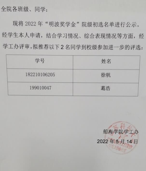 现将2022年“明波奖学金”院级初选名单进行公示。经员工本人申请,结合学习情况、综合表现情况等方面,经学工办评审,拟推荐以下2名同学到校级参加进一步的评选: