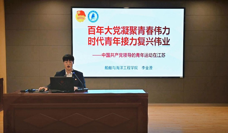 李金澄同学以青年力量开启民族崭新征程为开篇,回顾了新文化运动的历程。接着以时间为线索,从新民主主义革命时期、社会主义建设与改革时期、中国特色社会主义进入新时代等方面讲述了一代又一代的江苏青年在重大历史事件中的勇于担当和敢于作为,用青春之我创造青春之中国、青春之民族。