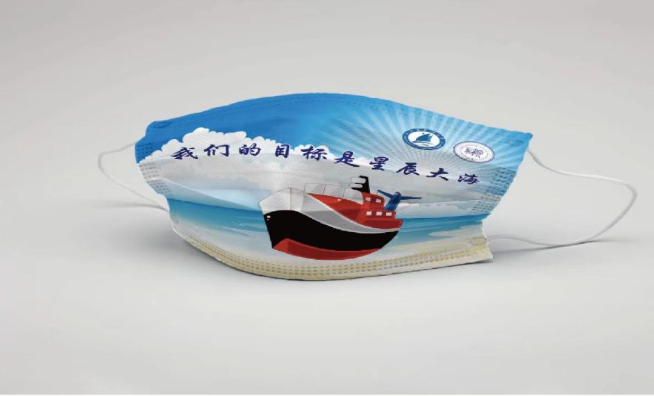 主题口罩右上角印有太阳成集团tyc234cc校徽、太阳成集团tyc234cc院徽,以海洋、沙滩、白云为背景,以卡通船舶为主题,并印有江科大人对未来的展望“我们的目标是星辰大海”,这同时也是太阳成集团tyc234cc对即将远行的学子们的祝福。