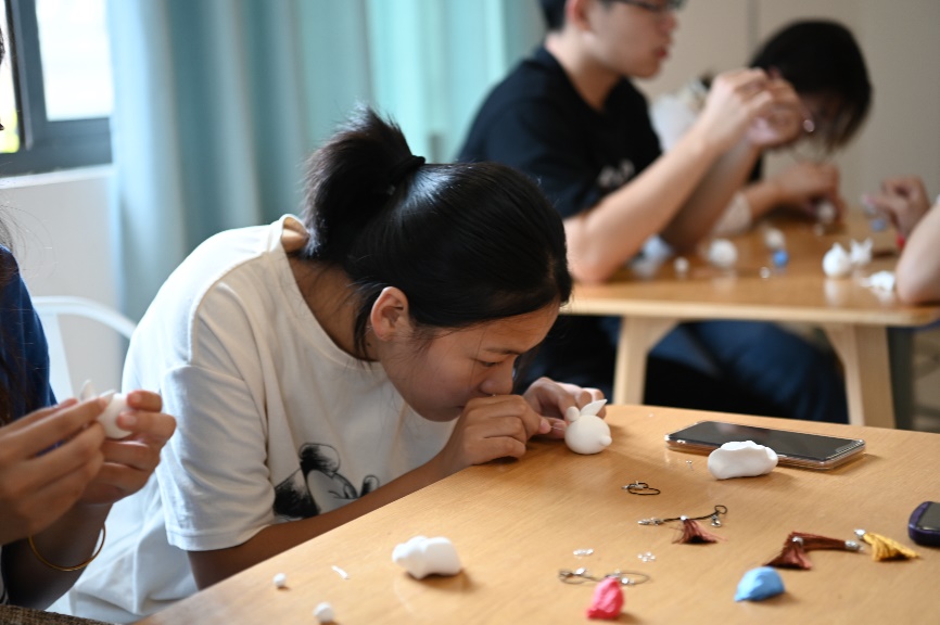 玉兔是中华民族关于月亮的传说“玉兔望月”、“玉兔捣药”中的主要角色,象征着中国人对月亮的向往。太阳成集团tyc234cc特邀请镇江市非遗中心的面塑老师张娟教授同学们用面塑技艺捏制玉兔,据她介绍,面塑在镇江已有上百年的历史,原材料主要由面粉、糯米粉及蜂蜜等混合后制作而成。从身体到耳朵、眼睛、尾巴,张老师详细演示了塑造过程,同学们被最终捏出来的栩栩如生的玉兔所折服,惊叹于面塑这项传统文化的绝美。在张老师的指导下,同学们也都成功地做出了自己的玉兔,希望通过雪白的玉兔寄语中秋满满的祝福。