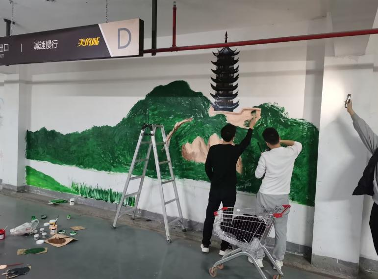 活动开展之前,实践团成员进行了深入调查,在充分了解社区要求和征求小区物业意愿后最终确定了以党的二十大报告中提出的新时代新征程中国共产党的使命任务之一“推动绿色发展,促进人与自然和谐共生”为主题,一幅以“不忘初心、牢记使命”为主题要求着我们要牢记历史和使命,不断奋进,继续砥砺前行。另一幅则是镇江代表性景点镇江金山寺,以大片绿色渲染,极具镇江山水特色,同时也体现出了党的二十大中指出的中国式现代化就是人与自然和谐共生的现代化这一要点。