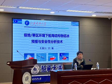 白旭教授围绕“加快实施一批具有战略性全局性前瞻性的国家重大科技项目,增强自主创新能力”主题,从研究背景、实验方案、实验结果等方面向同学们讲解了“极地/寒区环境下船海结构物结冰预报与安全性分析技术”,结合具体的船舶结冰典型特征进行了机理分析,让大家对极地船舶结构物的结冰预报技术的研究有了一定了解。博士生陈鑫作为本硕博均在江科大就读的优秀代表,就自己的科研历程和经验展开了分享,他提出做科研思想上要重视、态度上要端正、方法上要正确,要学会学习、学会利用工具,以及尽可能多地参加学术研讨会。硕士生崔福音从学科竞赛的角度就如何获得互联网+老员工创新创业大赛全国银奖的经历与经验进行了交流,就如何在高水平学科竞赛中取得优异成绩进行了分享。