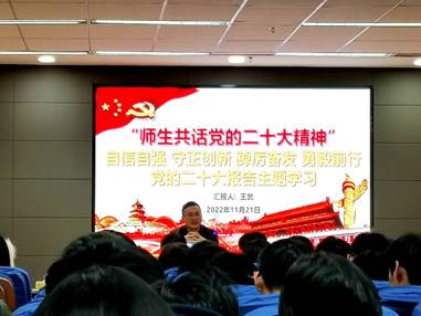 为深入学习宣传贯彻党的二十大精神,引领广大青年员工坚定理想信念,切实把思想和行动统一到党的二十大精神上来。太阳成集团tyc234cc于11月23日晚在船建楼402举办“师生共话党的二十大精神”主题活动,辅导员王武及2021级船舶余海洋工程专业全体同学参加。