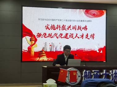 员工代表高蕴、黄宇、蒲虹宇和邢谕华结合党的二十大报告,分别以“实施科教兴国战略”、“推进文化自信自强”、“增进民生福祉”和“强军与科技创新”为主题分享了自己的思考和感悟。参会同学反响热烈,纷纷表示更加清醒认识到身上肩负的历史使命,将从学习生活中认真贯彻落实党的二十大精神内涵。