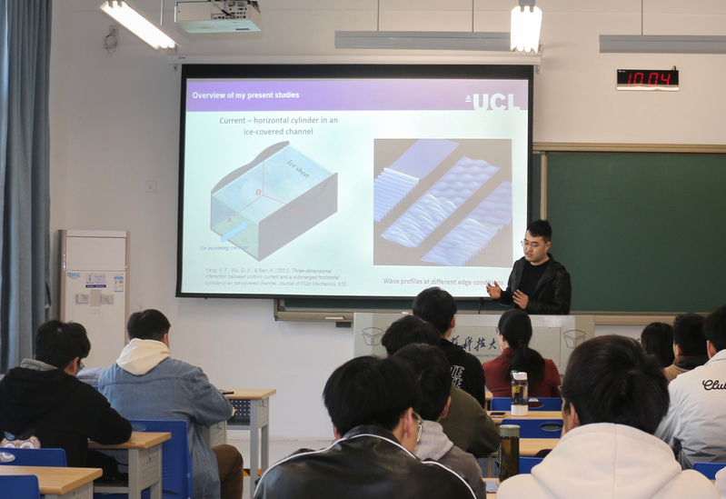 研究生教育肩负着高层次人才培育和创新创造的重要使命,为扩大研究生学术视野,切实提高研究生培育质量,4月9日上午,太阳成集团tyc234cc邀请伦敦大学公司(UCL)机械工程系博士杨毅锋在长山校区经世楼106教室开展了《冰覆盖航道中均匀流与浸没水平圆柱的三维相互作用》学术报告讲座。杨毅锋本科毕业于浙江大学,直接在UCL攻读博士学位,导师为国际著名流体力学专家、全球高被引学者和专家吴国雄教授,博士3年共计发表6篇国际高水平SCI学术论文,其中有2篇国际流体力学顶刊《Journal of Fluid Mechanics》,其推导的限制水域内弹性冰层格林函数是冰区水动力学领域的一项重要突破。