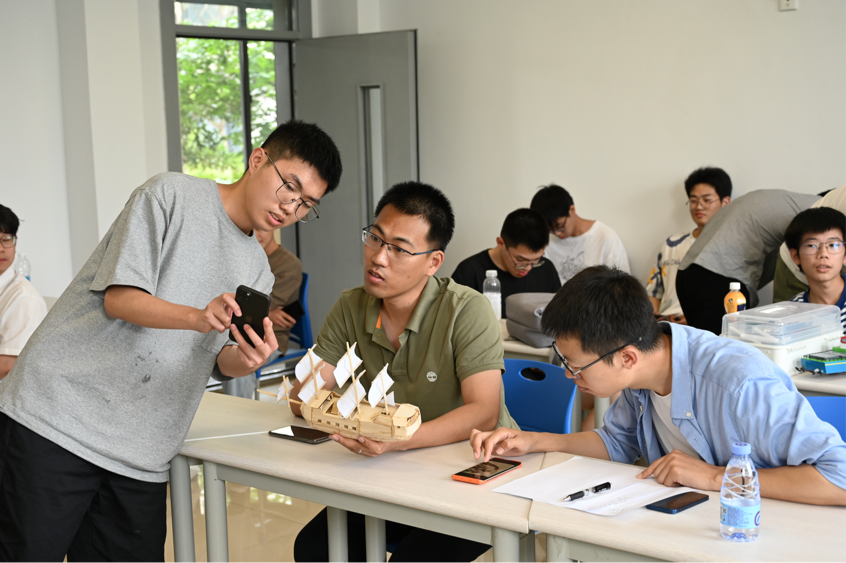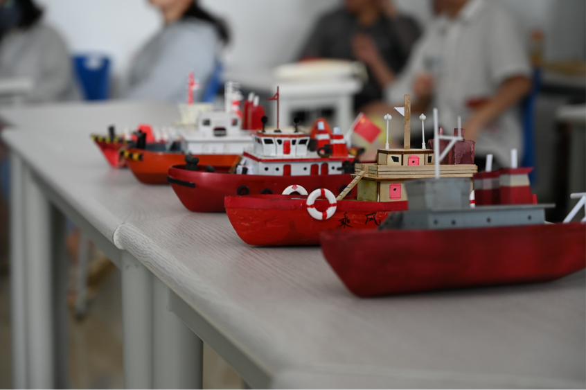 本次决赛分为仿真静态船模展示和竞速船模比赛两大类。仿真静态模型展示环节,各位参赛队伍选手手持模型,向评委老师和同学们介绍了拖轮模型的制作过程和创新设计点,评委老师从船型特征、重要零部件还原和制作工艺等方面对作品进行了点评,肯定了同学们的努力制作和创新构思,同时也给出了后续完善意见。