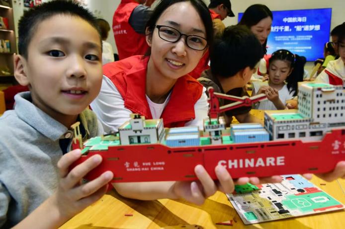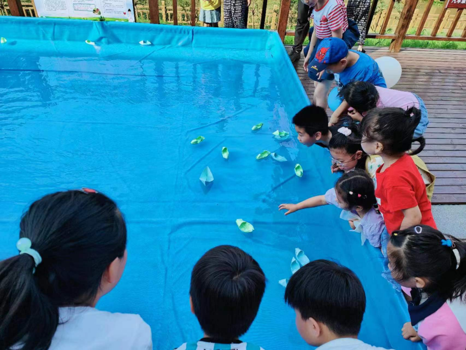 为激发孩子们对船舶的兴趣,普及船舶知识,实践团成员将准备好的“辽宁舰”、“雪龙号”等与孩子们分享,让他们近距离的观察船的构造,感受船舶的美。在孩子们充分了解船舶之后,实践团成员与小朋友们一起现场制作电动船模,加深他们对船的认知,锻炼他们的动手创新能力。随后,大朋友们与小朋友们共折纸船,并在水池中让承载着梦想的小船扬帆起航。
