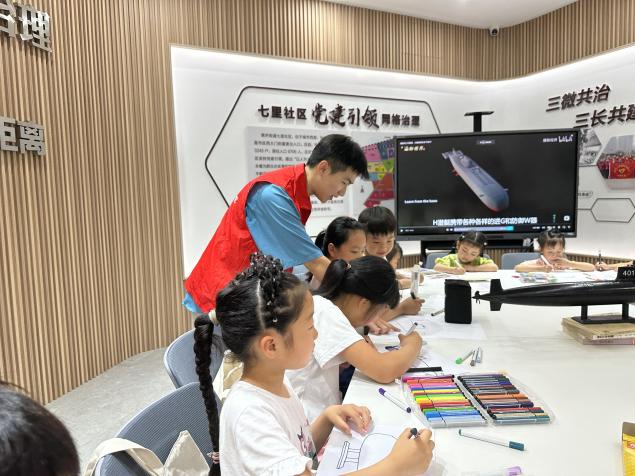 在开展舰船科普讲座之余,实践团成员在七里社区党群服务中心进行课业辅导,他们细致地解答小朋友们在完成暑期作业中遇到的问题,耐心地回答他们在学习生活中碰到的困惑。