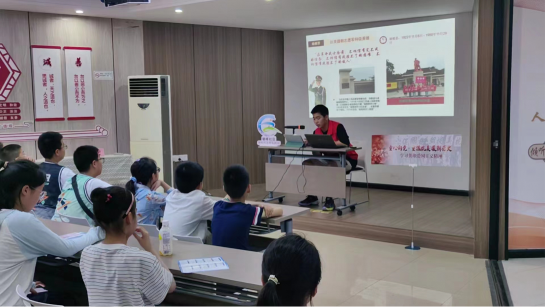 宣讲伊始,张天浩给社区孩子们分享了小分队在杨根思烈士陵园参观的所见所闻,并给大家讲述了杨根思烈士传奇且光荣的一生,孩子们全神贯注,纷纷表示出对杨根思烈士伟大一生的尊重与敬佩之情。