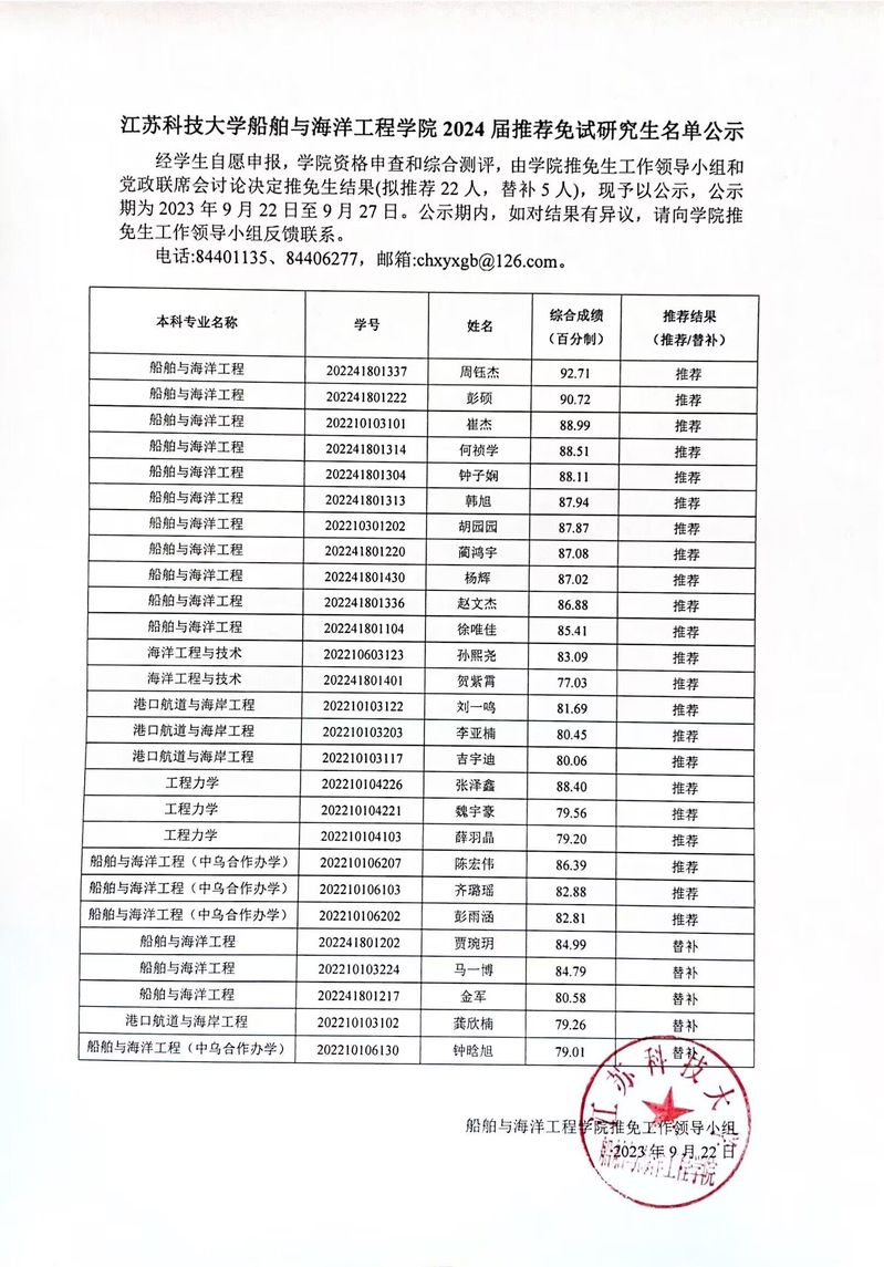经员工自愿申报,公司资格审查和综合测评,由公司推免生工作领导小组讨论决定推免生结果(拟推荐22人,替补5人),现予以公示,公示期为2023年9月22日至9月27日。公示期内,如对结果有异议,请向公司推免生工作领导小组反馈。联系电话:84401135、84406277;邮箱:chxyxgb@126.com。