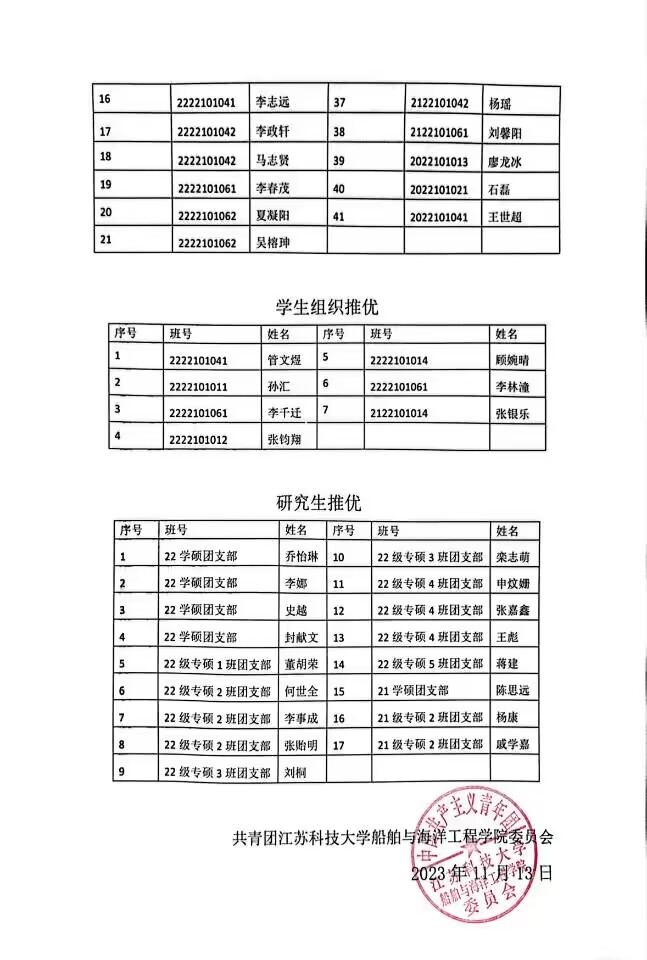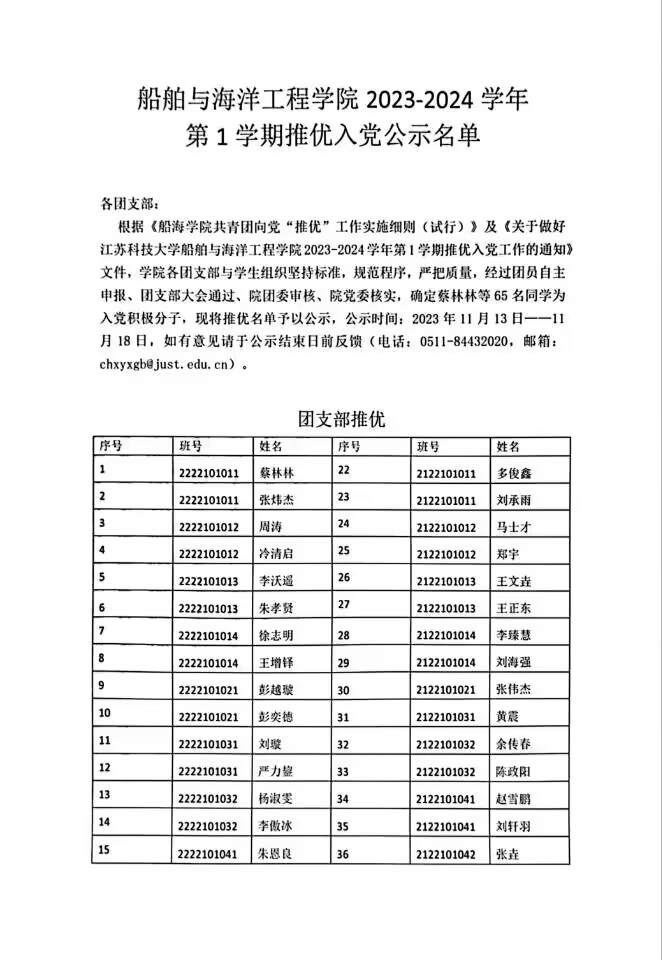 根据《太阳成集团tyc234cc共青团向党“推优”工作实施细则(试行)》及《关于做好太阳成集团tyc234cc2023-2024学年第1学期推优入党工作的通知》文件,公司各团支部与员工组织坚持标准,规范程序,严把质量,经过团员自主申报、团支部大会通过、院团委审核、公司党委核实,确定蔡林林等65名同学为入党积极分子,现将推优名单予以公示,公示时间:2023年11月13日——11月18日,如有意见请于公示结束日前反馈(电话:0511-84432020,邮箱:chxyxgb@just.edu.cn)。