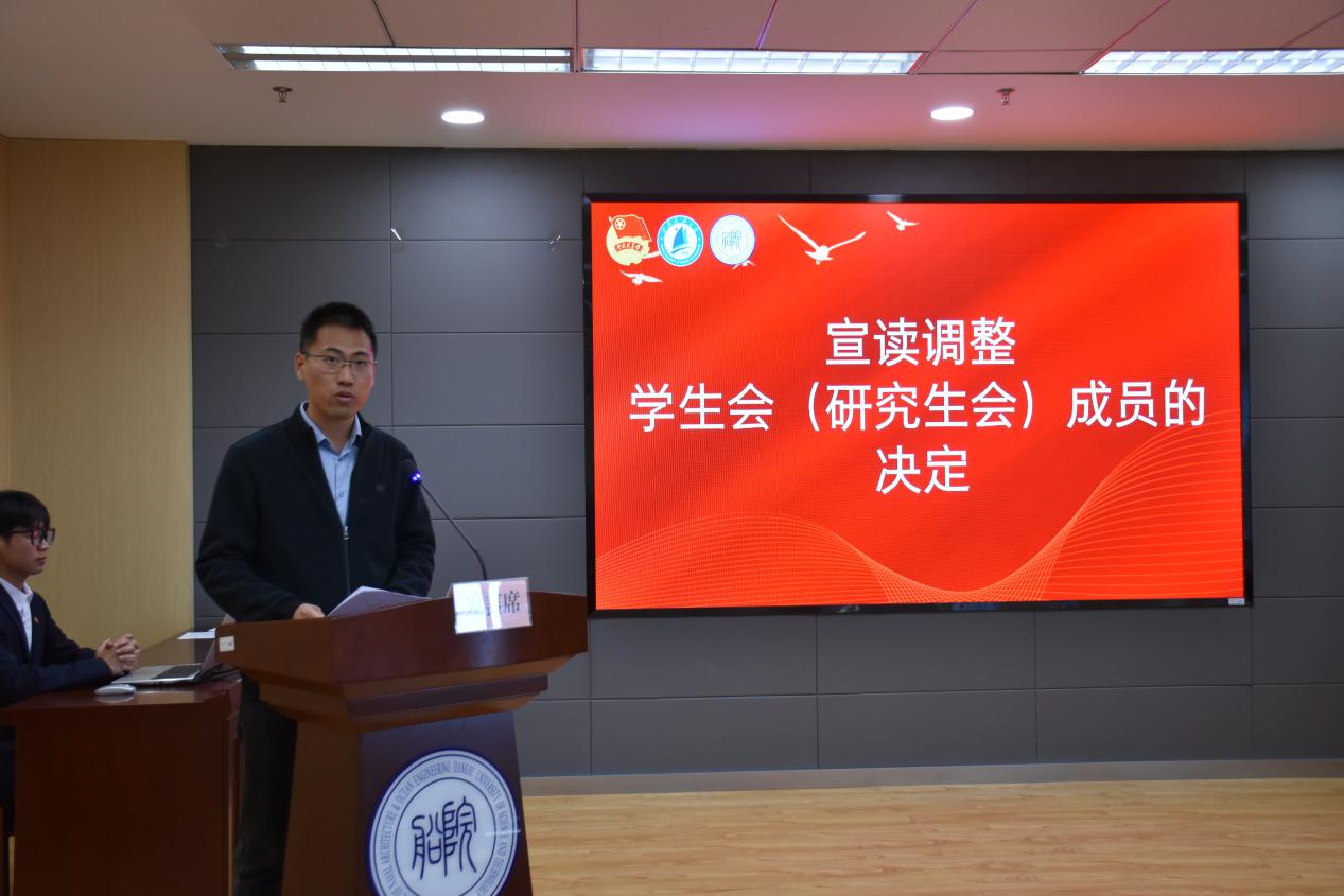 太阳成集团tyc234cc员工会主席团成员王子硕代表第三十二届员工会向大会作工作报告,研究生会主席团成员周恒代表第十届研究生会向大会作工作报告,与会代表听取审议后鼓掌通过。随后,夏志平宣读了《关于调整太阳成集团tyc234cc第三十二届员工会、第十届研究生会主席团成员的决定》,并向主席团成员颁发了聘书。