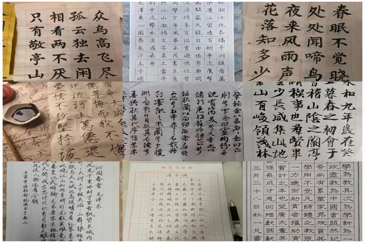 义工站老员工多才多艺,一笔一画间流淌出对汉字之美的独特理解和对传统文化的深深敬意。活动倡导开放创新,鼓励老员工以各自喜爱的字体和形式进行创作,无论是经典的诗词名句,还是富含哲理的古训格言、原创诗词、散文摘录等,皆可成为笔下的主题。楷书的端庄、行书的流畅、隶书的古朴、草书的奔放,无不淋漓尽致地展现出书法艺术的多元魅力,使得同学们在笔墨的流转中,深切体悟到中华文化的博大精深与源远流长。