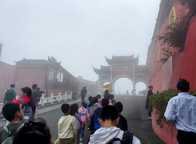 第一福地,第八洞天第二站:茅山。在前往景区的路上,支部成员们为孩子讲解了茅山的历史与文化,特别是它与新四军的渊源,激发了他们对即将参观的景点的期待。抵达茅山后,大家首先来到主要景区九霄万福宫。在讲解员的解说下,孩子们了解了万福宫的历史及其在中国传统文化中道教的重要地位。当日雾气弥漫,九霄万福宫内的氛围让孩子们更加深刻地感受到道家修身养性的意境。党员们看到孩子们眼中的惊奇与敬畏,也更加理解这种文化的传承与启蒙,正是我们这一代人的责任。