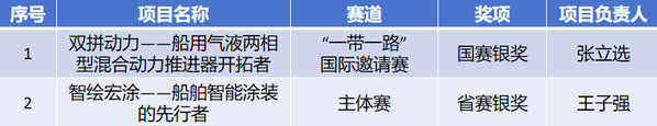 船海公司党委高度重视该项赛事,院领导积极组织动员全院教师积极谋划项目,从赛事伊始,围绕项目培育、材料完善、后勤保障,为参赛师生提供全方位支持和指导。由沈中祥老师指导的《双拼动力——船用气液两相型混合动力推进器开拓者》项目在“一带一路”国际邀请赛中获国赛银奖;由徐江敏老师指导的《智绘宏涂——船舶智能涂装的先行者》项目在江苏省主体赛中获省赛银奖。