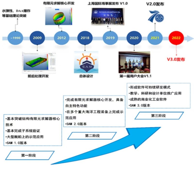 SAM(Structure Analysis of Marine structures)是由中船集团中国船舶科学研究中心及下属奥蓝托公司联合国内优势力量研发的一款具有自主知识产权的通用CAE软件。以结构有限元分析为核心,对标国际大型CAE软件NASTRAN、ANSYS、ABAQUS,支持静力、模态、稳态、瞬态、非线性等常用分析,效率与精度均属世界先进水平。并结合工程实际加入了环境载荷、结构安全评估、振动噪声和爆炸冲击等模块,支持Python及C++的二次开发,已应用于航天、航空、船舶、汽车、机械、电子等多个领域。