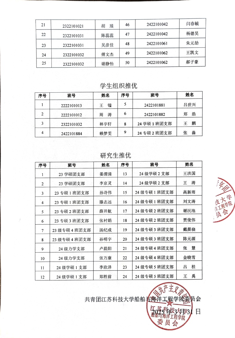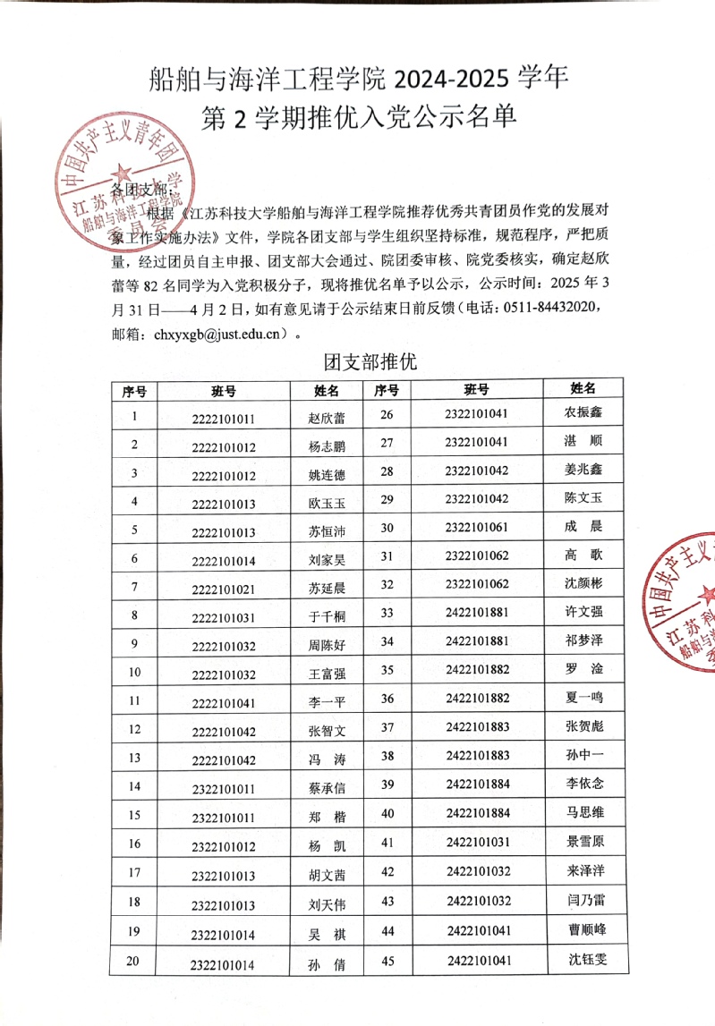 根据《太阳成集团tyc234cc推荐优秀共青团员作党的发展对象工作实施办法》文件,公司各团支部与员工组织坚持标准,规范程序,严把质量,经过团员自主申报、团支部大会通过、院团委审核、公司党委核实,确定赵欣蕾等83名同学为入党积极分子,现将推优名单予以公示,公示时间:2025年3月31日——4月2日,如有意见请于公示结束日前反馈(电话:0511-84432020,邮箱:chxyxgb@just.edu.cn)。