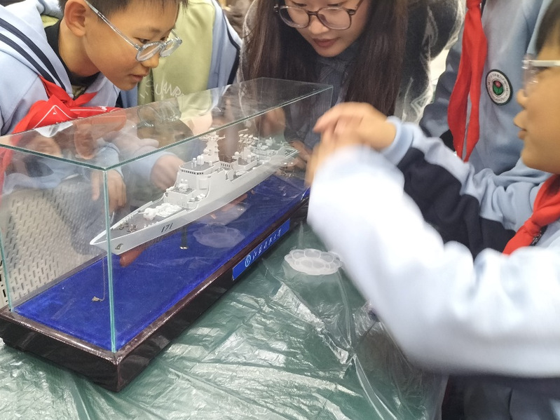 员工骨干们以“泰州号”、“海口号”驱逐舰等模型为教具,对其进行了详细介绍。这种直观学习比课本更震撼。许多孩子第一次理解了“万吨大驱”背后的技术突破。“原来每一艘军舰都是科技的‘变形金刚’!”同学们感慨道。通过互动问答环节,又激发青少年对海军科技的兴趣,传递“海洋强国”理念。活动强调,海军的强大不仅是国防实力的象征,更是民族自豪感与凝聚力的源泉,呼吁大家关注海洋、支持海军建设,共同守护蓝色国土。