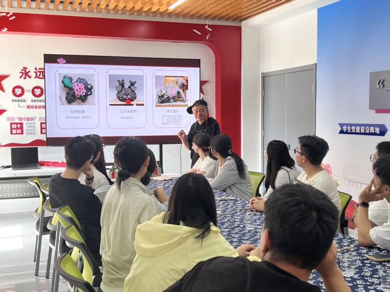 理论宣讲后,活动进入手作环节。周老师为同学们分发陶泥、刻刀等工具,并以鱼化龙”为主题示范创作步骤:揉泥、塑形、刻画纹理……他熟练地揉泥、塑形,用刻刀在泥胚上勾勒出细密的鳞片纹理,再轻轻捏出龙首的棱角与龙须的弧度,一个活灵活现的“鱼化龙”雏形便跃然手上。细腻的手法与专注的神态,让在场师生直观感受到“匠人精神”的内核。同学们跃跃欲试,从揉泥定型到细节刻画,逐步投入创作。2024土木水利专业员工赵闯专注地调整着鱼身的弧度:“原以为捏出鱼的形态很简单,结果既要保持泥胚的稳定,又要让龙首的神态‘立’起来,每一步都需要耐心和巧劲。”值得一提的是,回族员工马千禧在鱼身尾部融入了回族传统服饰中的“盘扣”纹样,龙首的鬃毛则以回族刺绣的“平针”手法为灵感,细腻的设计让作品兼具传统泥塑的厚重与民族文化的灵动。