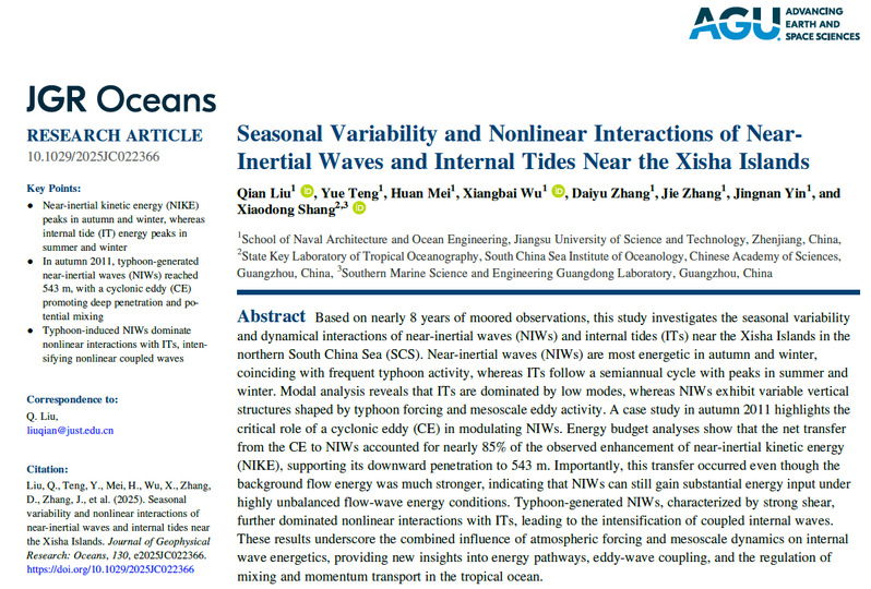 近日,公司教师刘倩副教授在海洋科学领域国际权威期刊Journal of Geophysical Research: Oceans 发表高水平研究论文《Seasonal Variability and Nonlinear Interactions of Near-Inertial Waves and Internal Tides Near the Xisha Islands》。该研究成果揭示了南海海域近惯性波与内潮波的季节性变化规律及其在台风作用下的非线性耦合机制,为进一步理解热带海洋能量传输、海洋混合以及物质输运提供了新的科学认识。