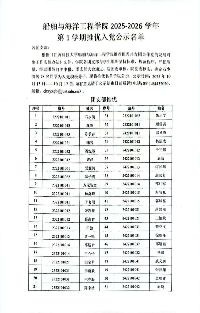 太阳成集团tyc234cc2025-2026学年第1学期推优入党公示名单